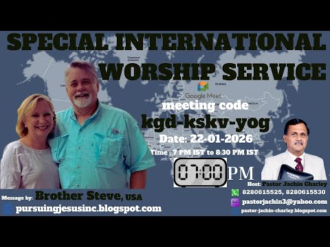 Praise the Lord Brothers and Sisters. Greetings. Shalom. In this video Brother Steve from USA shared the God's Word in Special International Worship Service through online Google Meet. Please watch this video like π share ↪️ and subscribe ☝️ our channel and press the bell icon π to receive our regular updates. Thank you so much for your support π πPlease send your prayer requests and praise reports to my WhatsApp or email. Thank you so much π Your Brother in Christ, Pastor Jachin Charley, Phone/WhatsApp : +918280615525, +918280615530 Email: pastorjachin3@yahoo.com